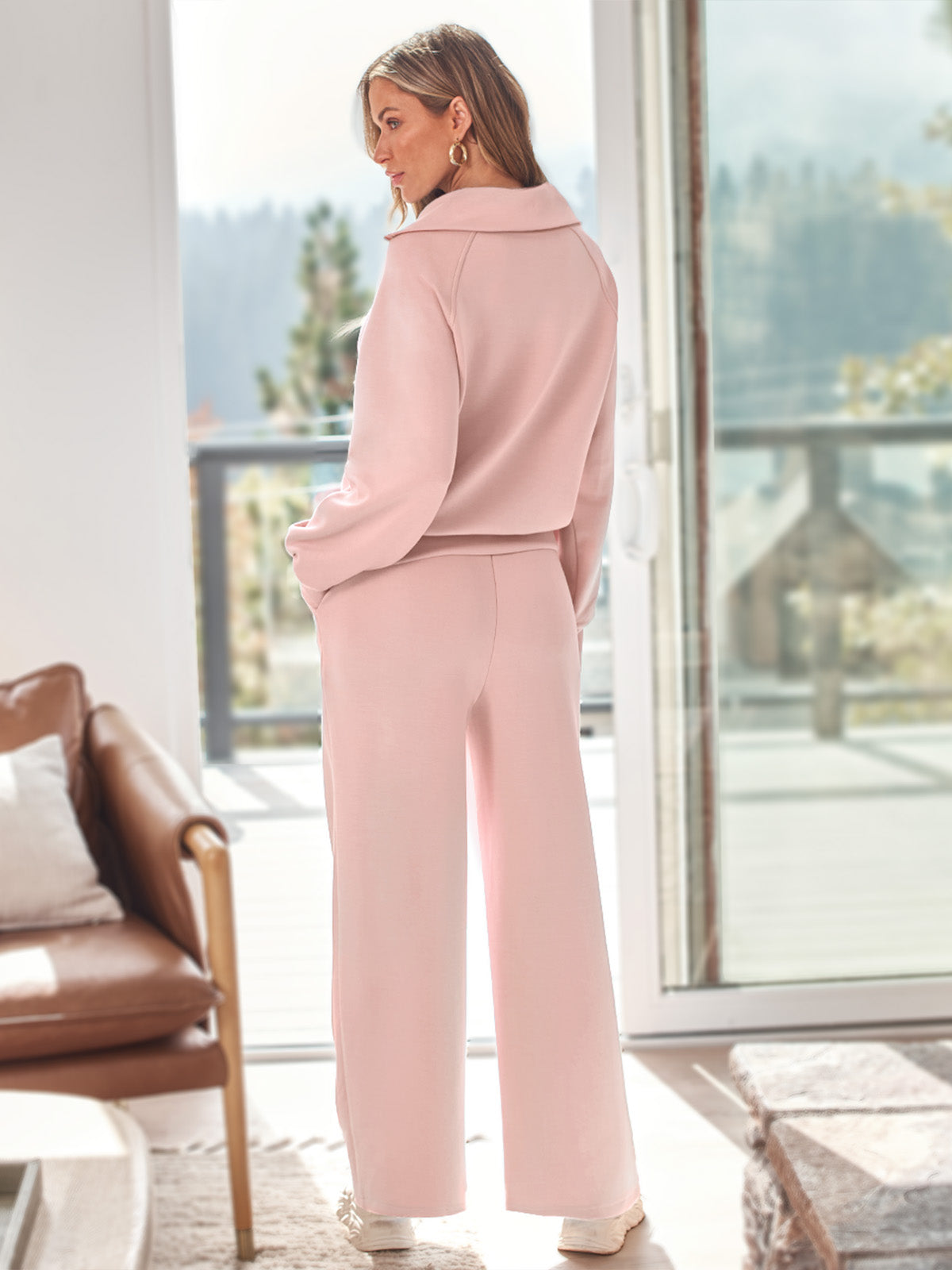 Product Style: Daily Leisure Style Product applicable scenarios: daily wear, sports, travel, etc Product applicable season: autumn and winter Core selling point: This set, consisting of a half zipper collar, long sleeves, and pants, is a loose fit and not picky about body shape. The upper body effect has a lazy feeling, and the straight leg pants look very slim when worn. Zipper stand up collar design, adjustable collar opening and closing at will, can balance warmth or ventilation. The hem has a slightly tapered design, not suitable for pairing with pants. The waist has an adjustable drawstring, which can be adjusted to the most comfortable tightness according to one's own body shape. There are side seam pockets on both sides of the pants, which can hold personal items such as mobile phones, wallets, keys, etc., freeing up hands when going out. Fabric: 55% cotton+40% polyester+5% spandex, with a thick but not stuffy feel, soft elasticity and support, providing a comfortable fit. Suitable for wearing in autumn and winter seasons. Matching: It is very suitable to match with sneakers, sports shoes, and flat shoes. Applicable occasions: Suitable for commuting wear, home leisure, outdoor shopping, light sports, travel and airplane wear. A set of clothing is comfortable and exquisite when worn out. Machine washable, hand wash in cold water. Do not bleach. Hot selling colors: Black Light pink Deep flower grey