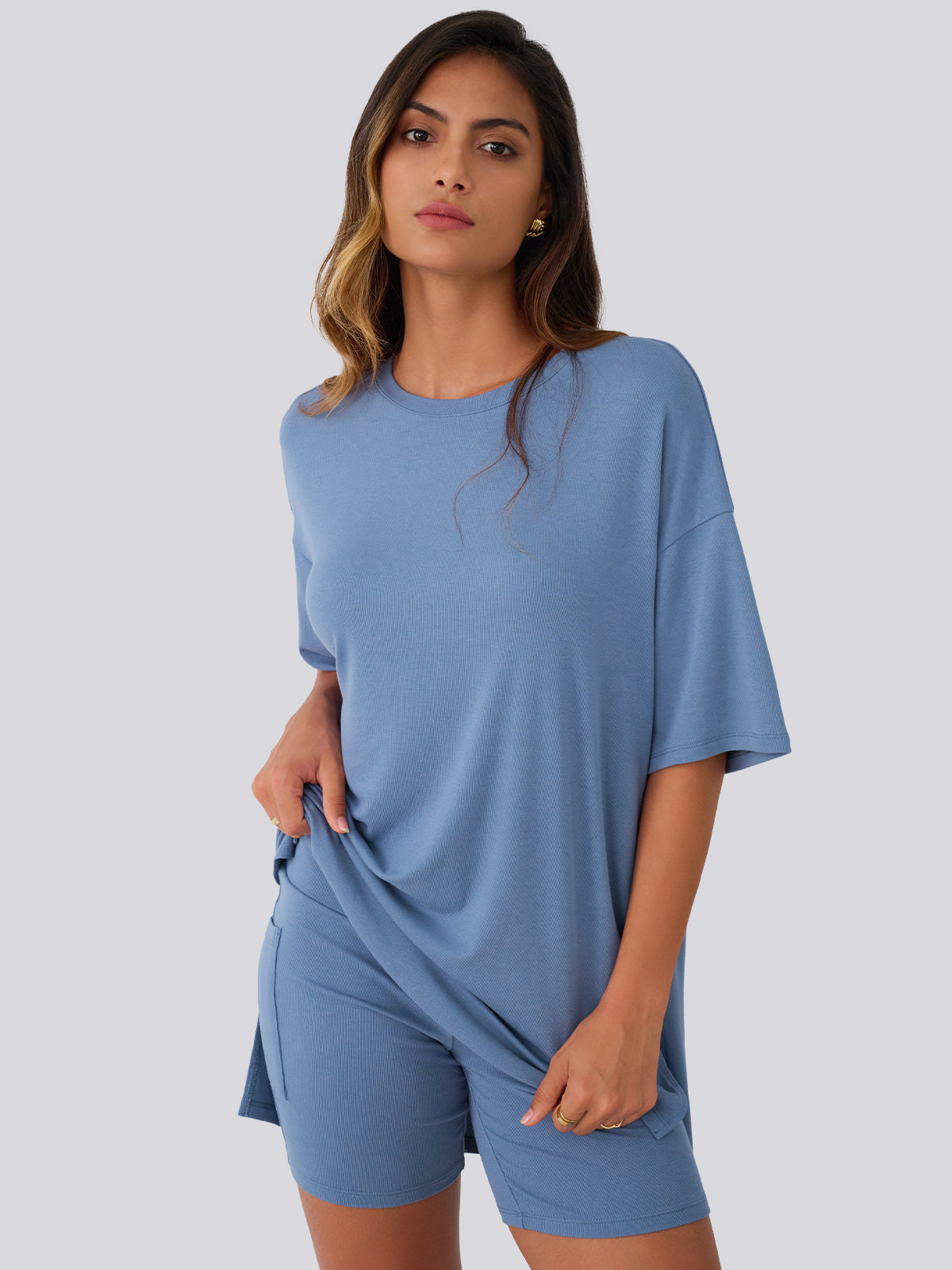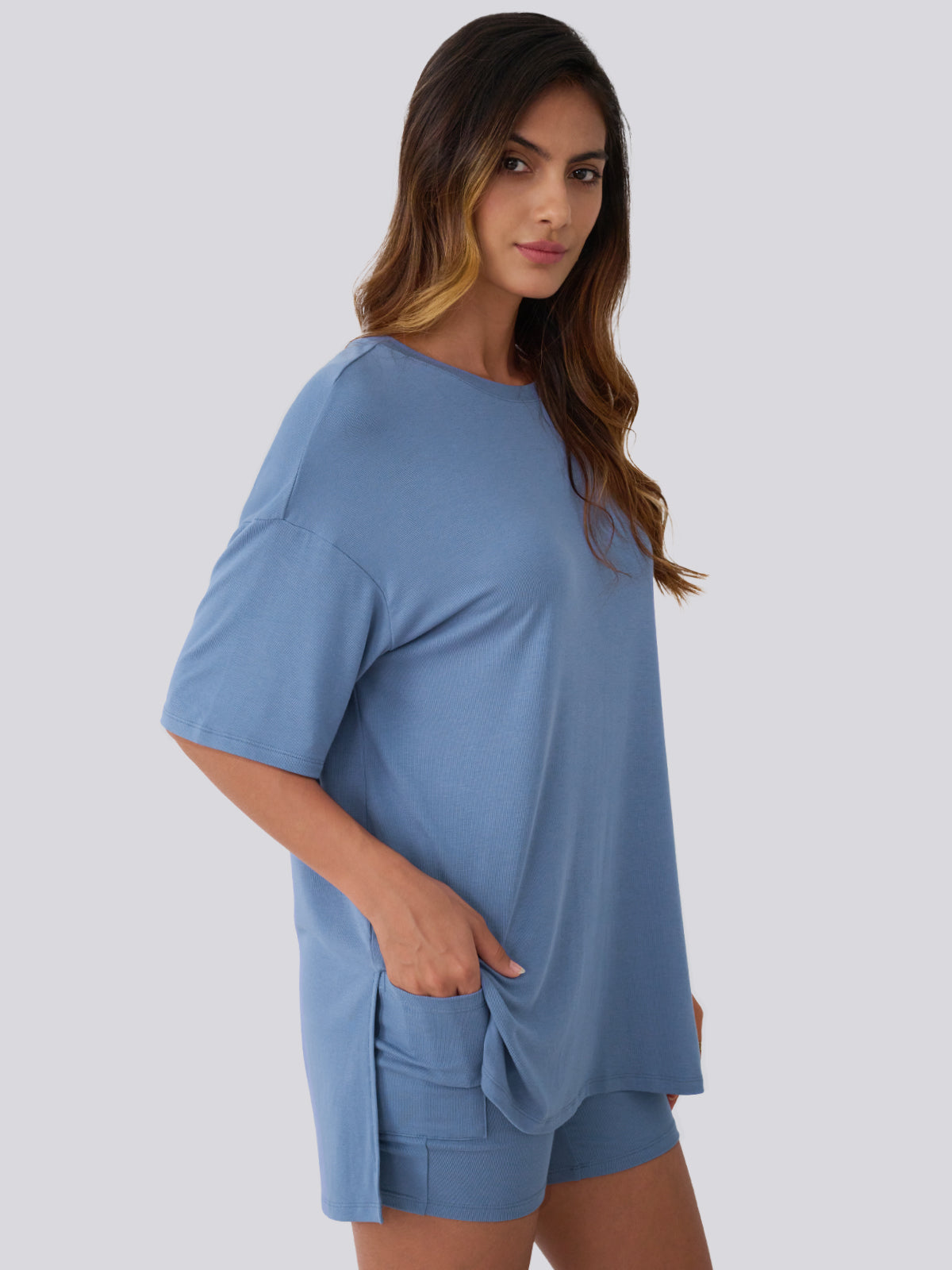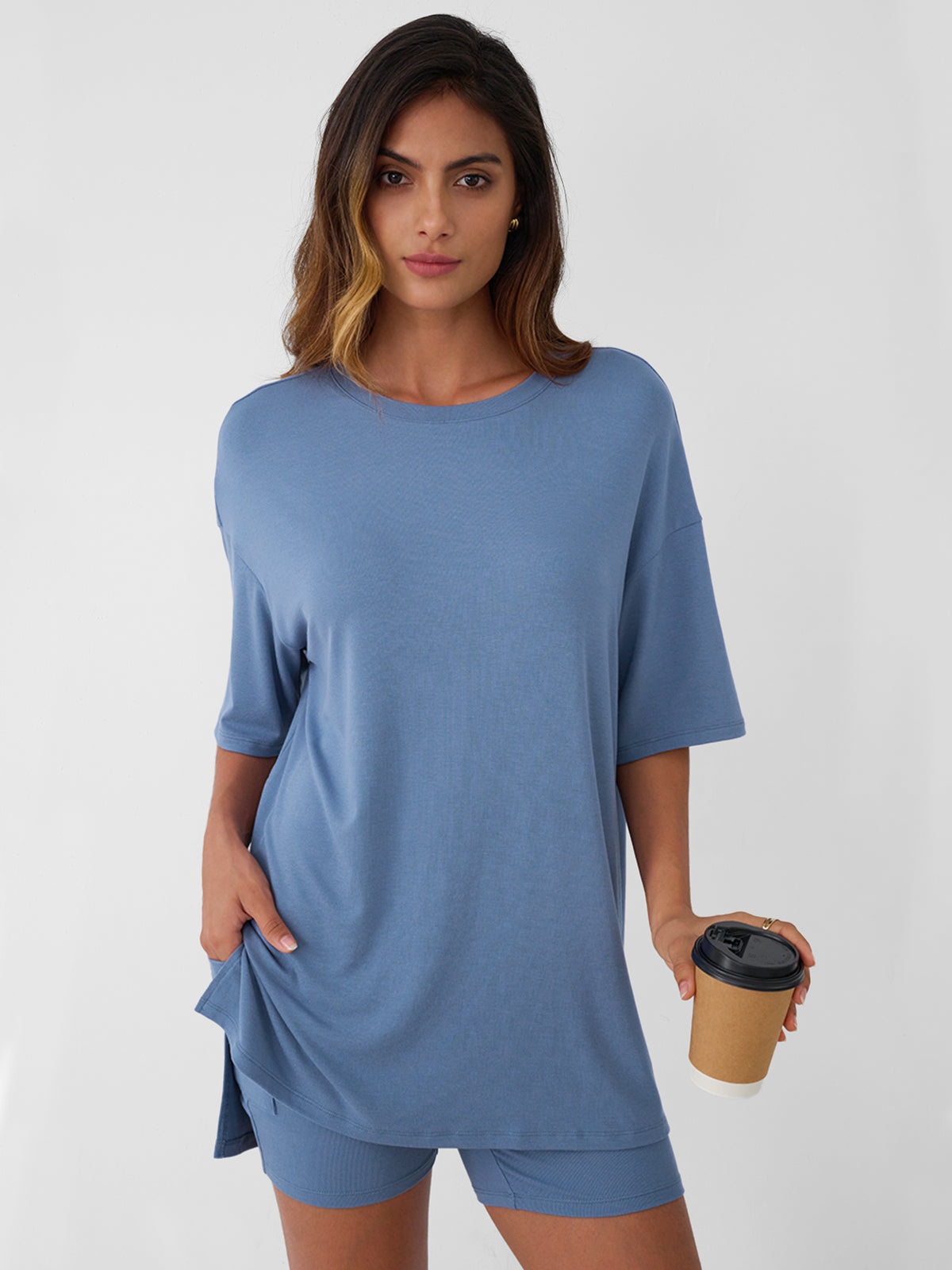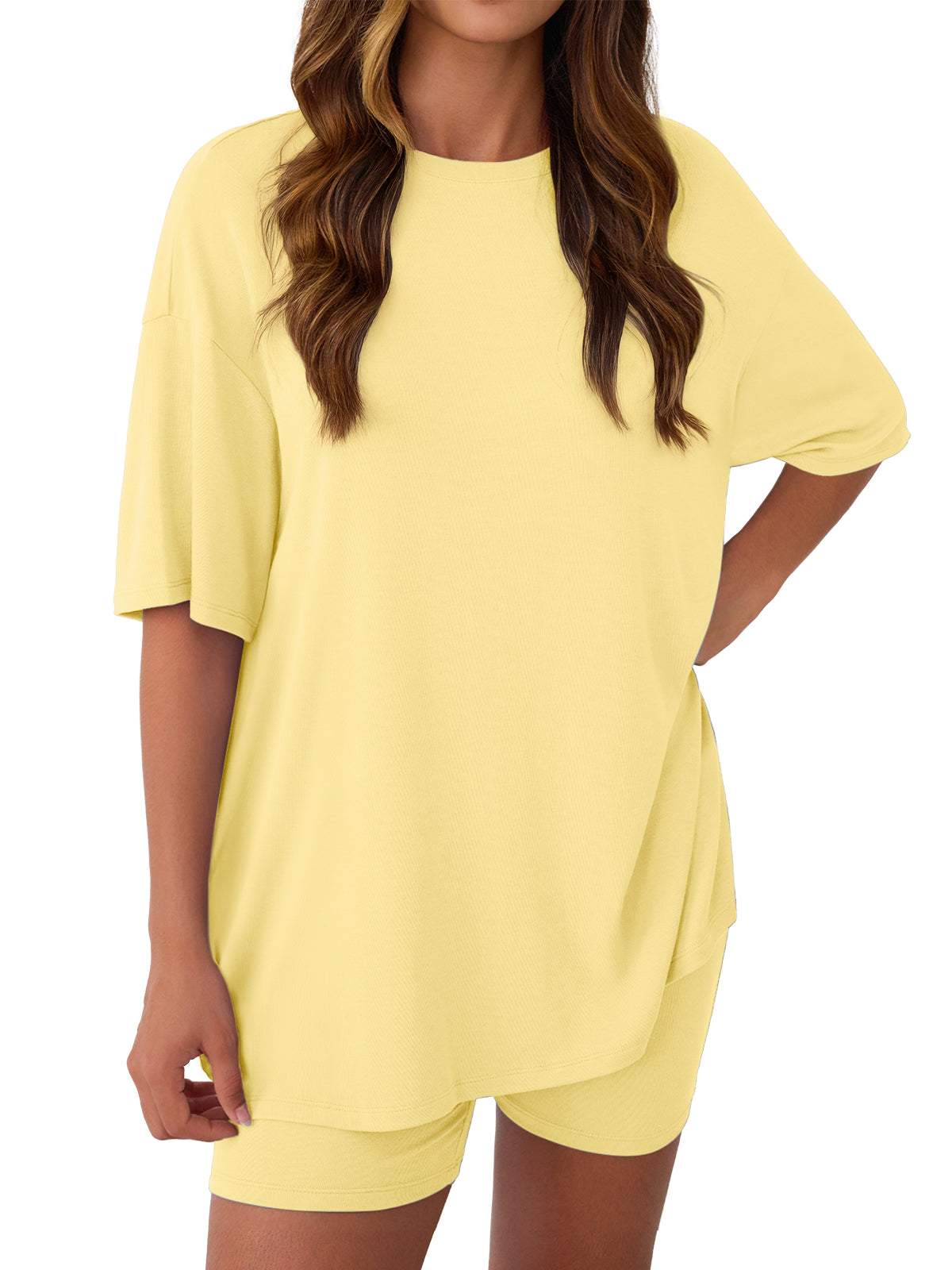 Product Style: Daily Leisure Style Product applicable scenarios: daily wear, sports, travel, etc Product applicable season: Spring and Summer Core selling point: This product is a set of short sleeved shorts. Ultra loose T-shirt with side slit design elements; The high waisted cycling shorts feature a pocket design that combines aesthetics and practicality. Fabric composition: 92% rayon and 8% spandex. The fabric is soft, elastic, and comfortable to wear,effectively preventing it from being see-through. Match: pair with sports shoes or casual shoes. Applicable occasions: Very suitable for leisure or participating in sports activities. Machine washable, hand wash in cold water. Do not bleach.