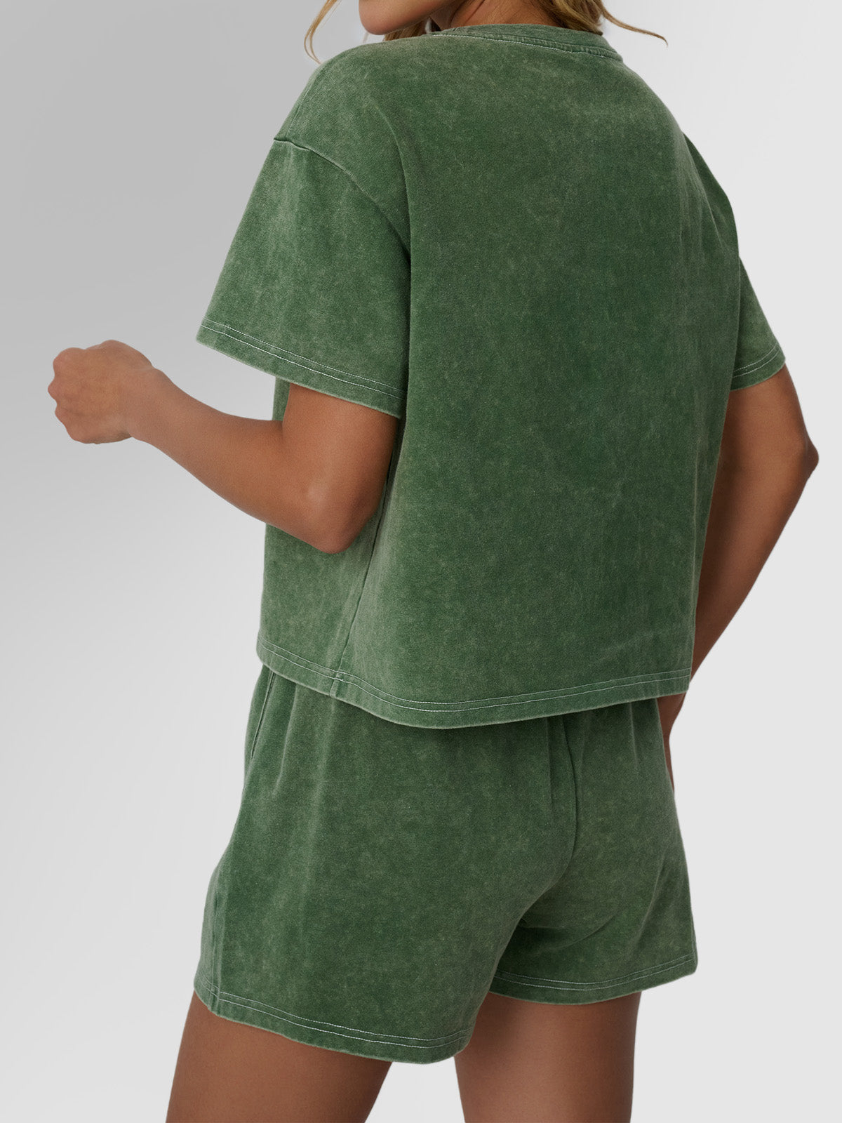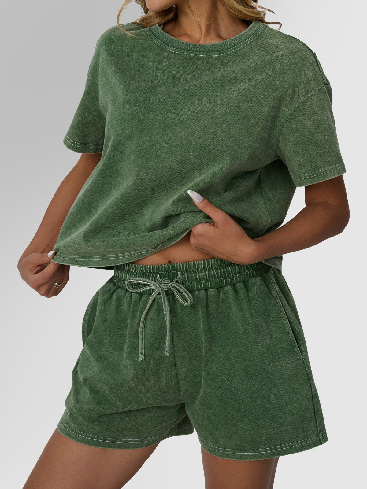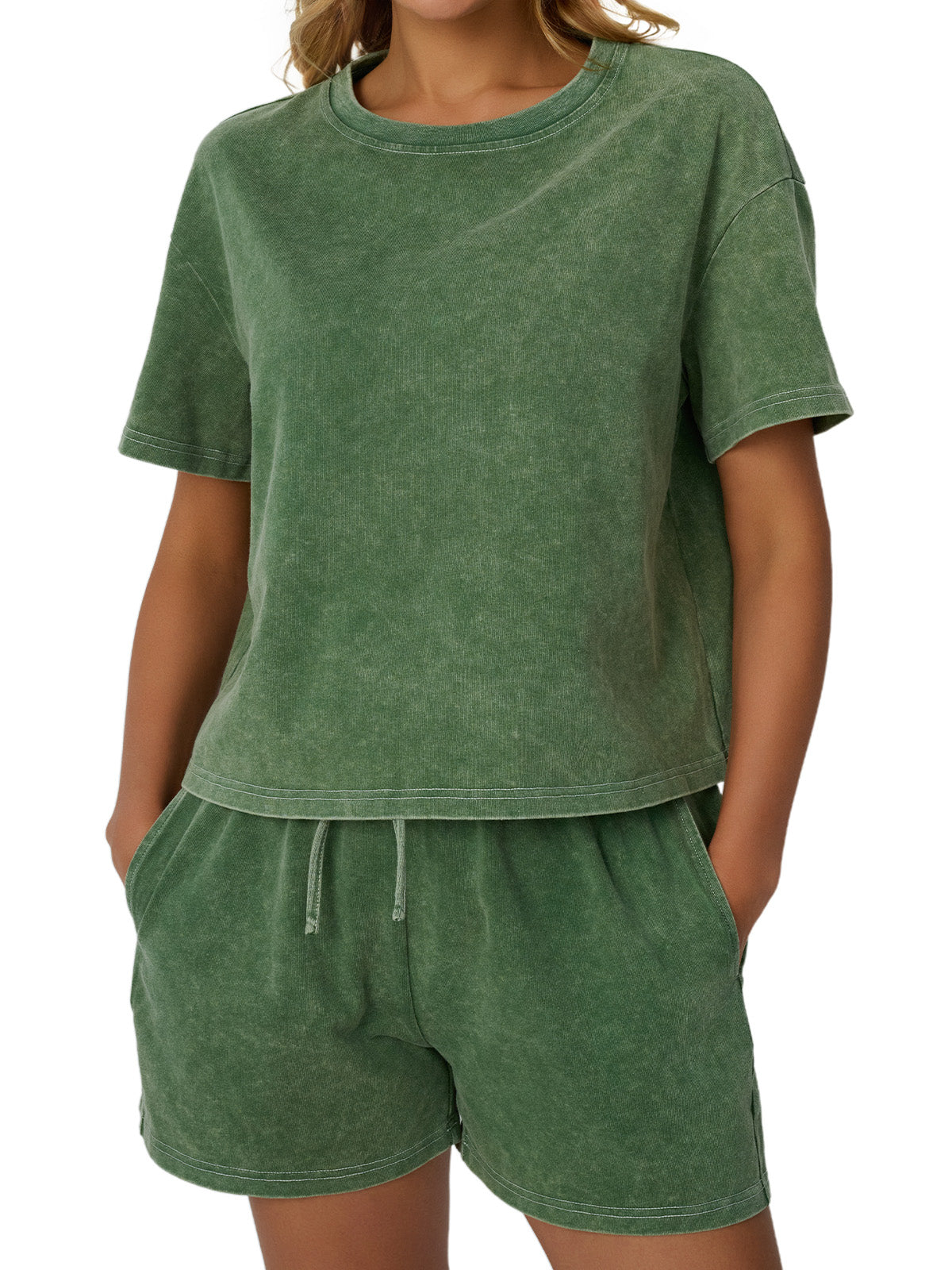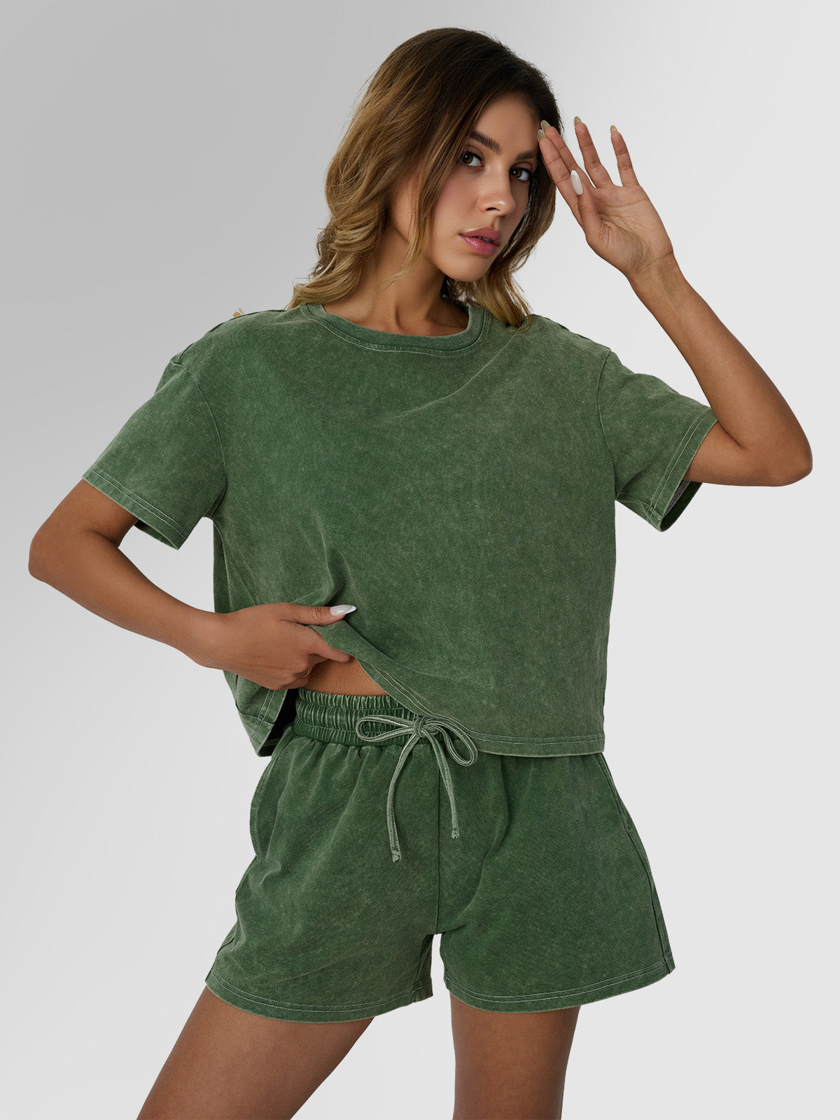 Core selling point: This pair of top uses a washing process, and each washing mark is a unique effect, showing a lazy and casual retro style. The top adopts a round neck design, which is easy to put on and take off. The dropped shoulder short sleeves can cover the thick parts of the arms. The top is a short and loose version, which has no restrictions on body shape and age. The fabric is soft and skin-friendly, suitable for long-term wear without fear of sweat.